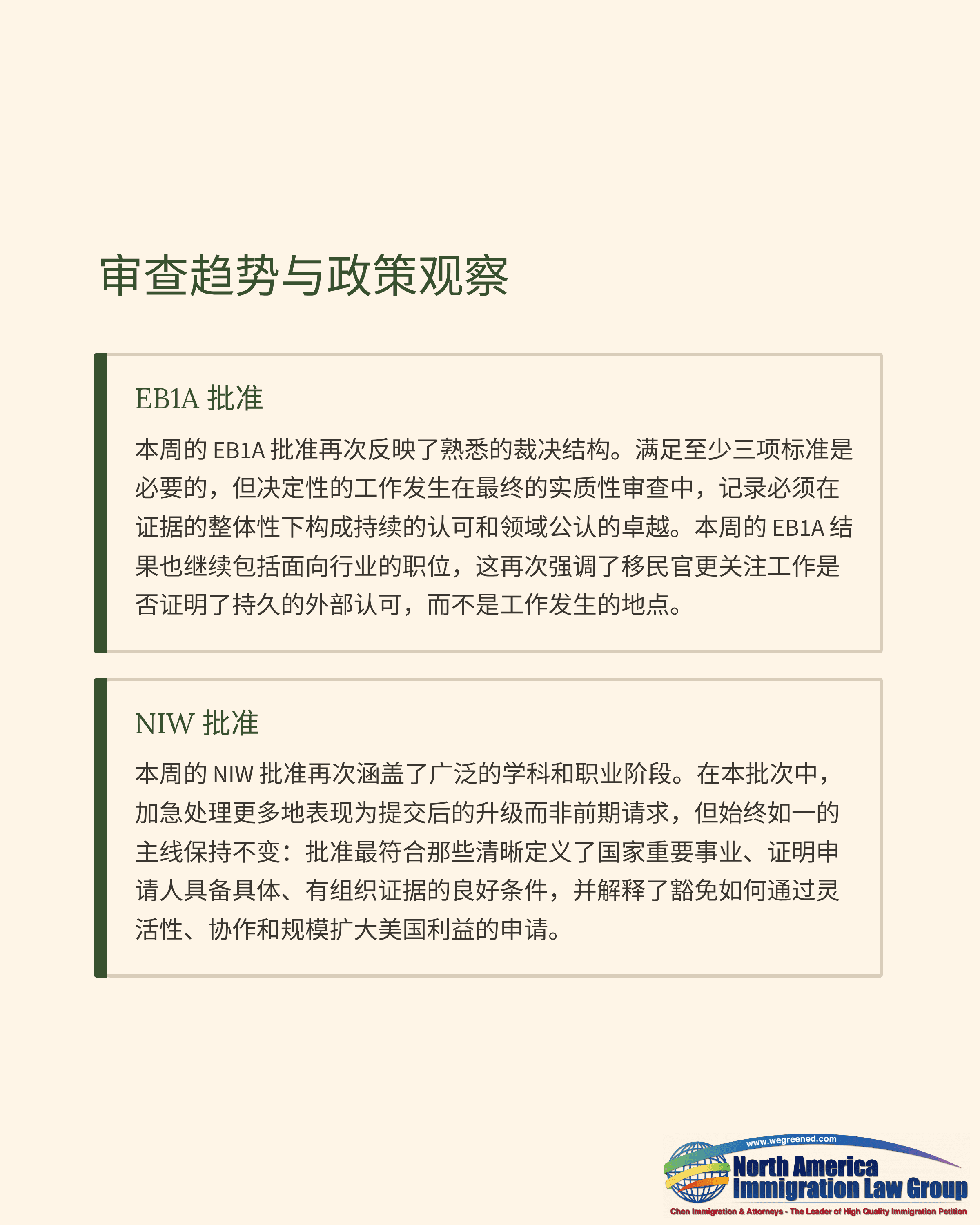 本周NIW继续占据多数,EB1A也保持强势表现,获批人群普遍能够在整体证据下证明“持续性赞誉与领域认可度”。