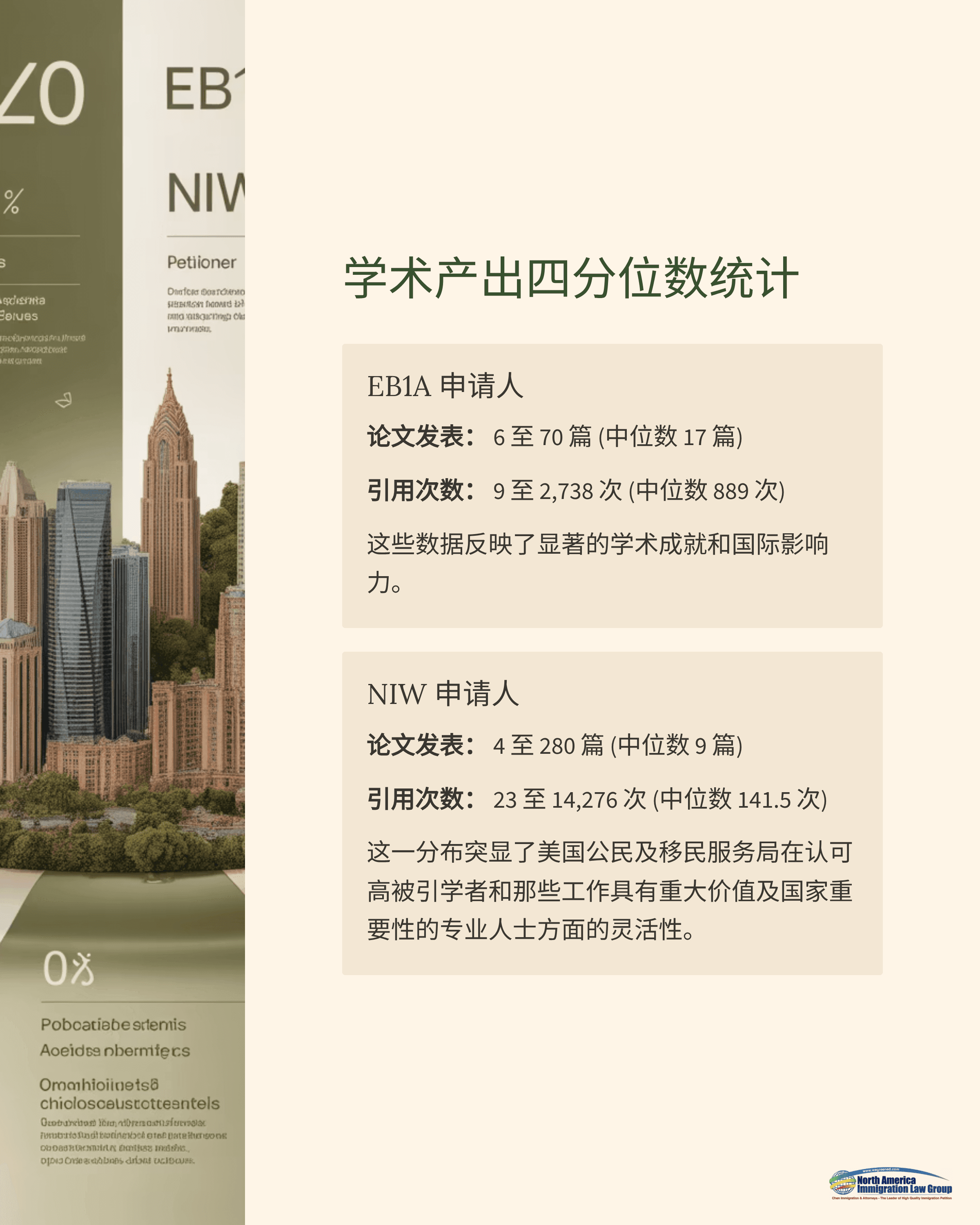 以上数据表明:EB1A申请人的发表与引用整体水平更高且更集中,体现出较强的学术影响力与国际同行认可;NIW的分布则更为宽泛,反映出USCIS在评估“实质性价值”和“国家重要性”时,对处于不同职业阶段、学术与产业并重的申请人保持较高弹性与包容度。