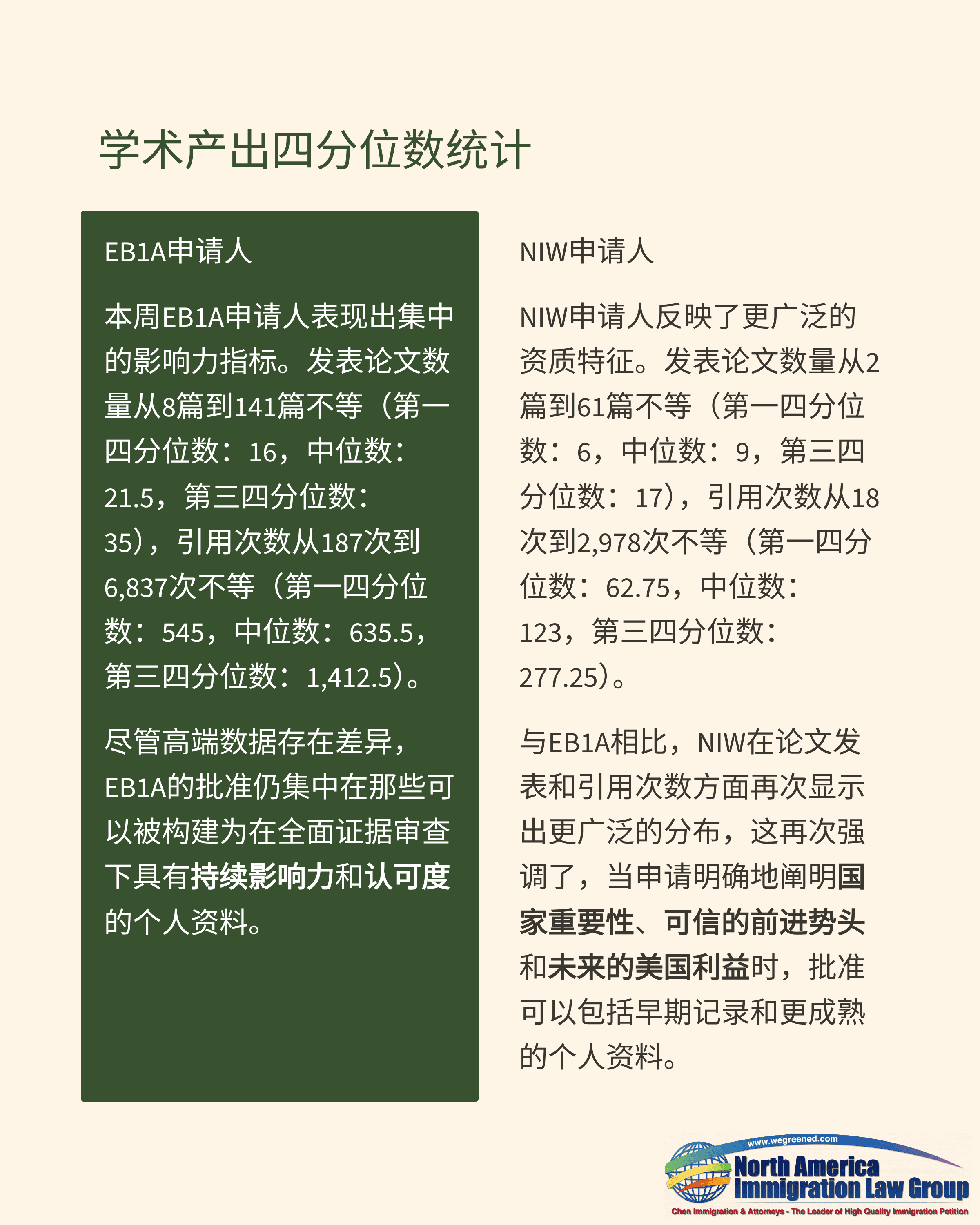 本周数据提供了一个值得关注的NIW信号:获批覆盖到了样本中引用量的最低端(包括产业界仅18次引用的获批案例),同时也延伸到更高引用区间。这说明NIW审理中,决定性因素往往不是引用数量本身,而是方向定义是否精准、证据是否能体现持续推进的进展,以及是否能清楚说明豁免如何扩大对美国的整体收益。