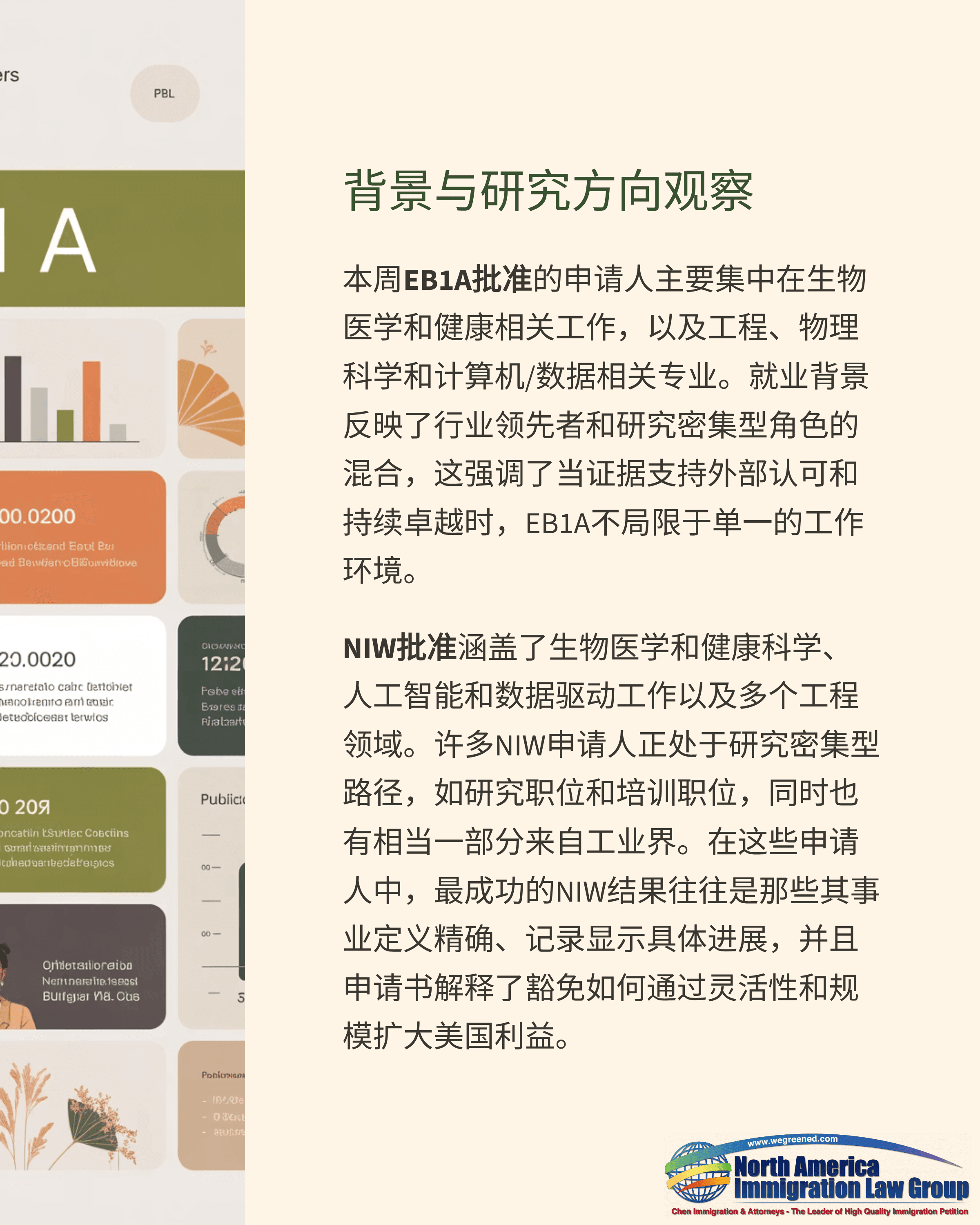 本周NIW依然占据多数,EB1A也保持稳定表现,获批人群普遍能够以整体证据证明“持续性赞誉与领域影响力”。