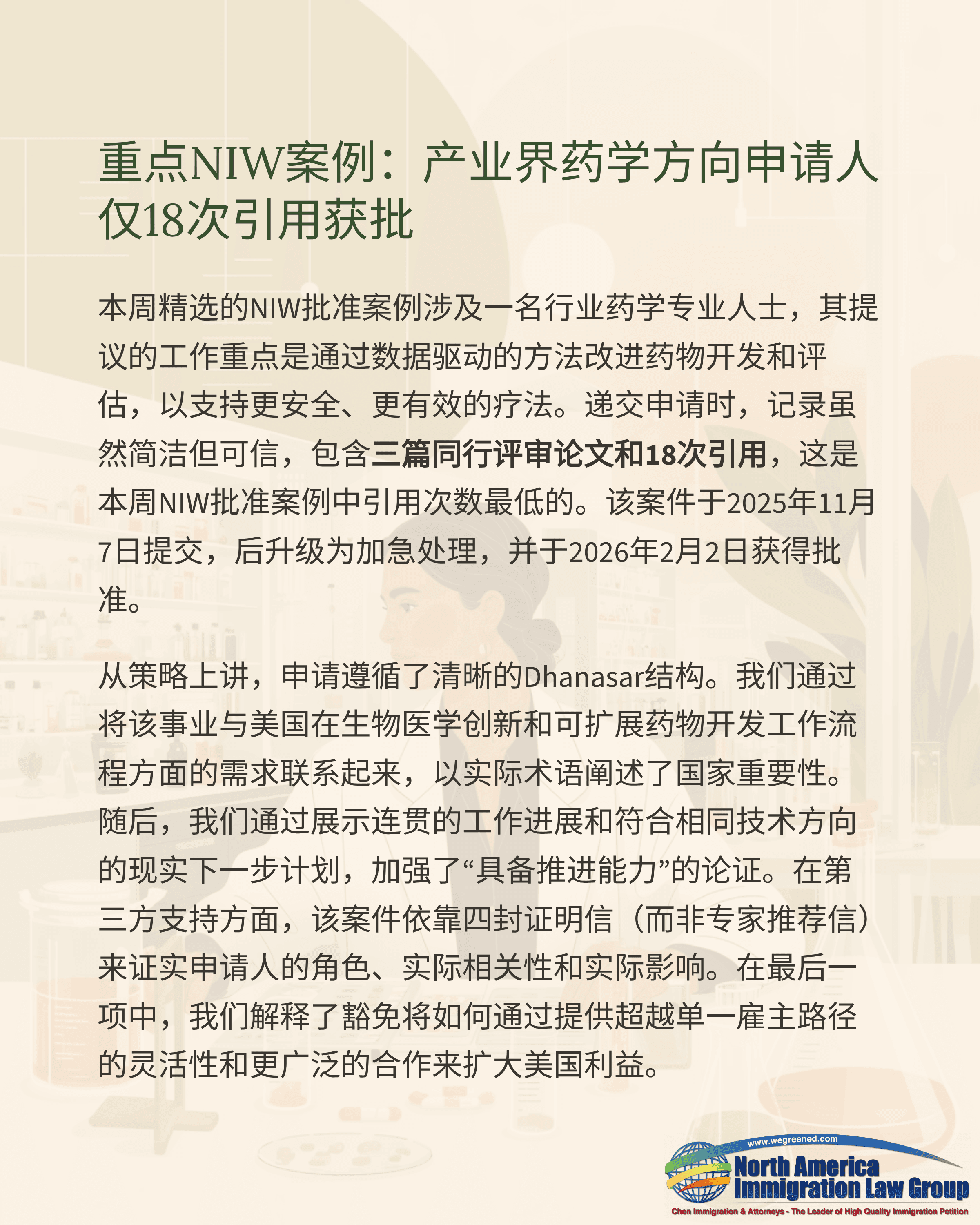 本周一例值得关注的NIW获批案例来自一位在产业界工作的药学/药物研发相关专业人士,其在美国计划开展的工作方向聚焦于推动更安全、更有效的治疗方案研发,包括在现代药理与药物评估流程中使用的数据驱动方法。递交时,申请记录体现出“精简但可信”的推进力度:3篇同行评审论文、18次引用,也是本周NIW获批样本中引用量最低的案例。该案于2025年11月7日递交,随后递交后升级加急审理,并于2026年2月2日获批。