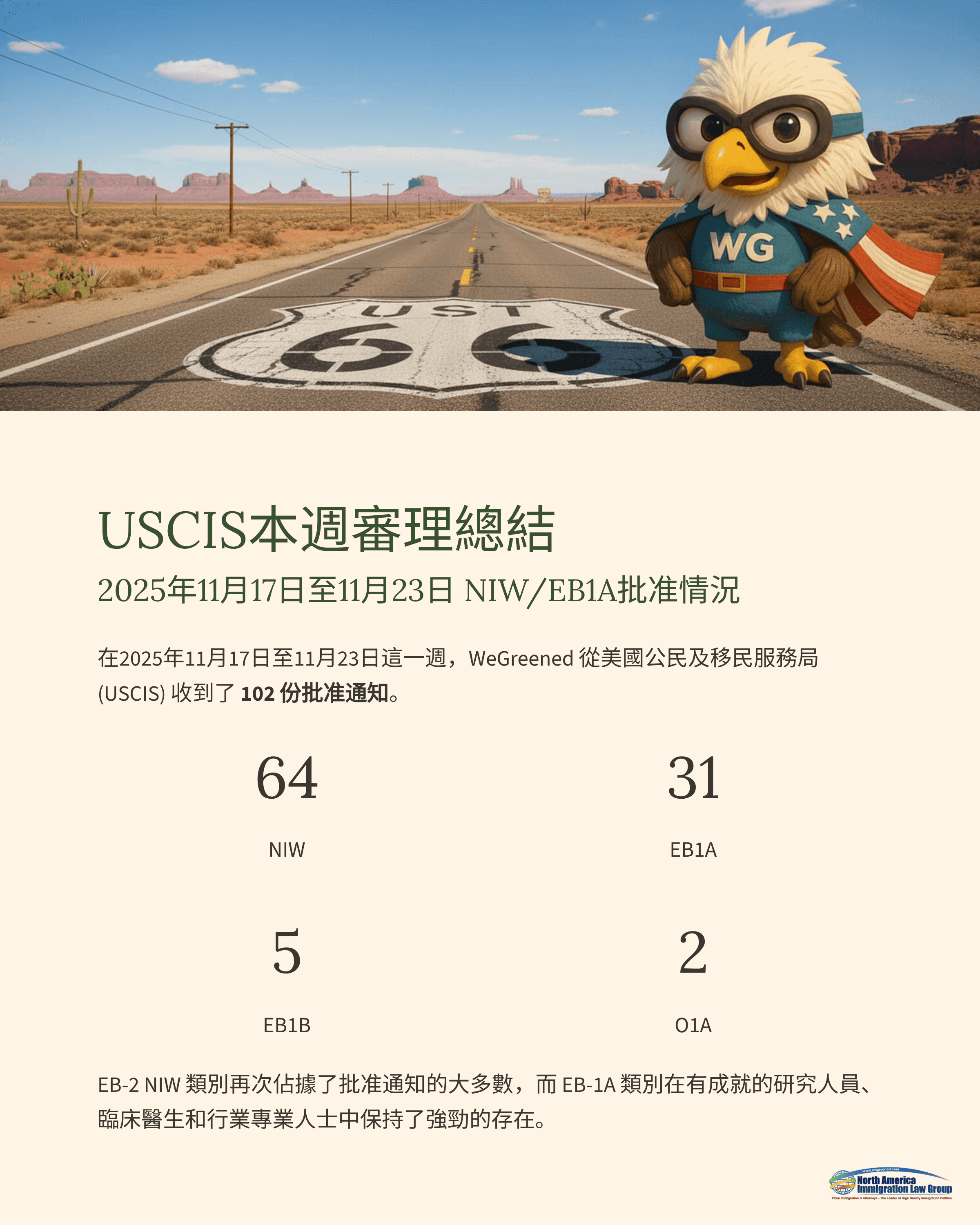 在2025年11月17日至2025年11月23日這一週內,WeGreened 共收到來自美國移民局(USCIS)的102份批准通知書。其中,NIW(國家利益豁免)64件、EB1A(傑出人才)31件、EB1B(傑出教授/研究人員)5件、O1A(傑出才能個人)2件。