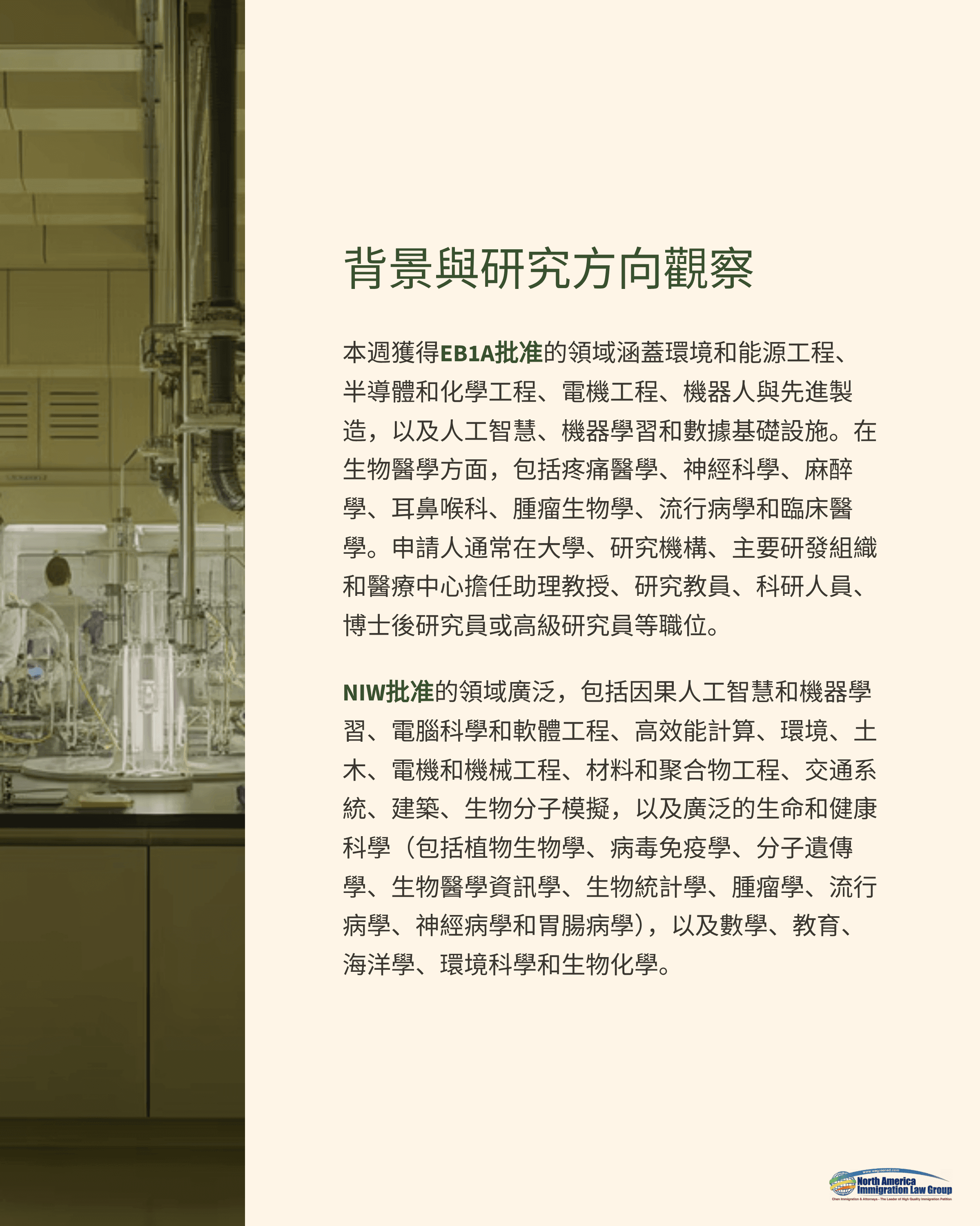本週EB1A獲批案件涵蓋環境與能源工程、半導體與化學工程、電機工程、機器人與先進製造,以及多個人工智慧、機器學習與資料基礎設施相關的電腦科學分支。在生物醫學與臨床領域,EB1A申請人涉及疼痛醫學、神經科學、麻醉學、耳鼻喉與頭頸外科、腫瘤生物學、流行病學與臨床醫學等方向。多數申請人任職於大學與研究機構,擔任助理教授、研究助理教授、研究員、博士後或資深研究科學家;亦有部分申請人服務於知名研發機構或醫療中心,承擔高責任度的研發或臨床科研角色。