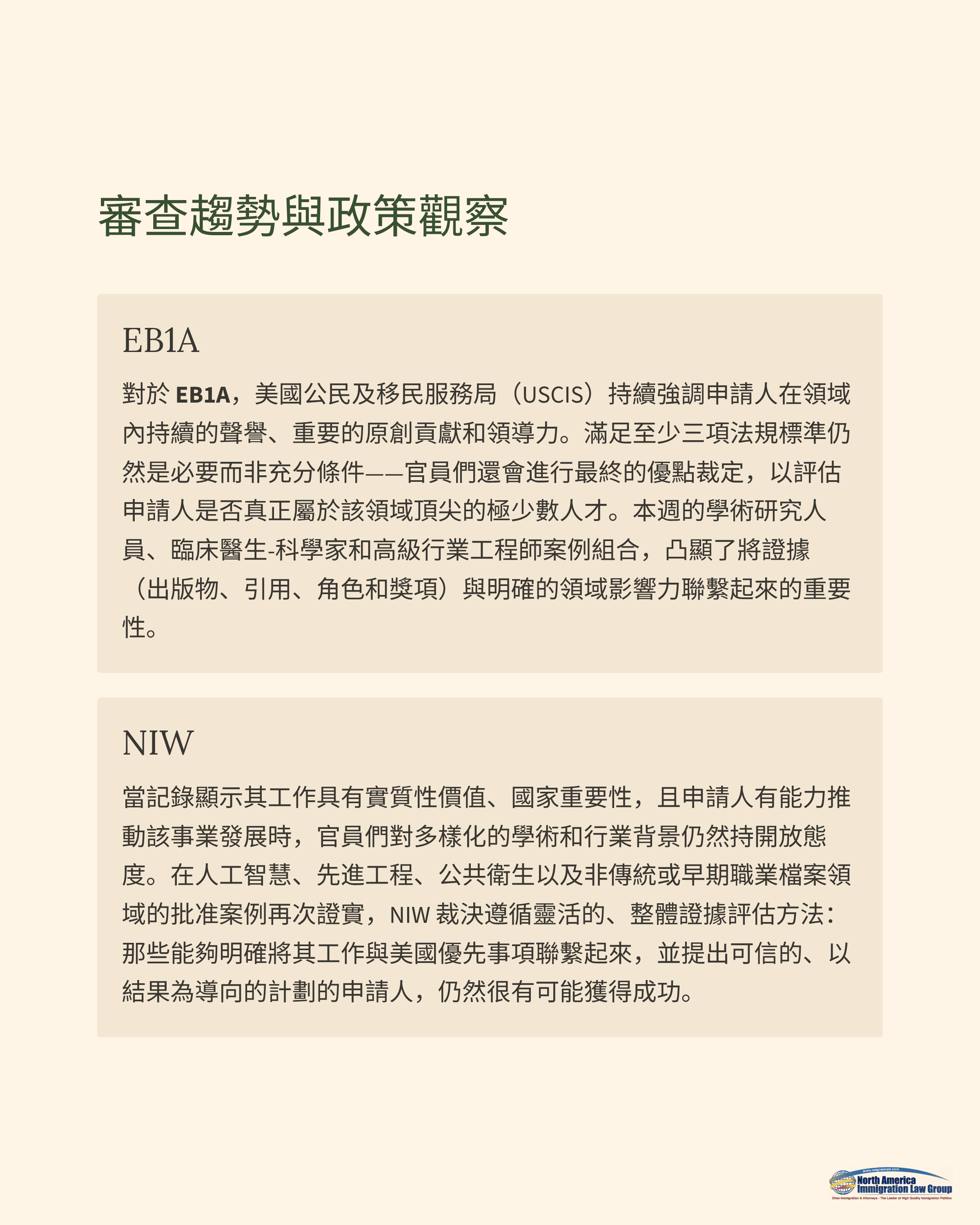 就NIW而言,USCIS持續對多元學術與產業背景保持開放態度,只要紀錄能充分支撐Dhanasar三項標準:其一,擬推動的事業具備實質性價值並關乎國家重要性;其二,申請人透過既往成就、同儕認可與在美發展規畫,證明自己「有能力推進該事業」;其三,從整體權衡來看,豁免工作邀請與勞工證要求,對美國整體更為有利。本週在AI、先進工程、公共衛生以及若干「非典型」或早期職涯背景上的獲批結果,再次表明:NIW審查採用的是彈性且整體性的證據標準。只要申請人能將自身工作清楚對接美國長期優先目標,並提出可信、結果導向的推進計畫,即便與同領域主流履歷有所不同,仍有機會在審理中取得成功。