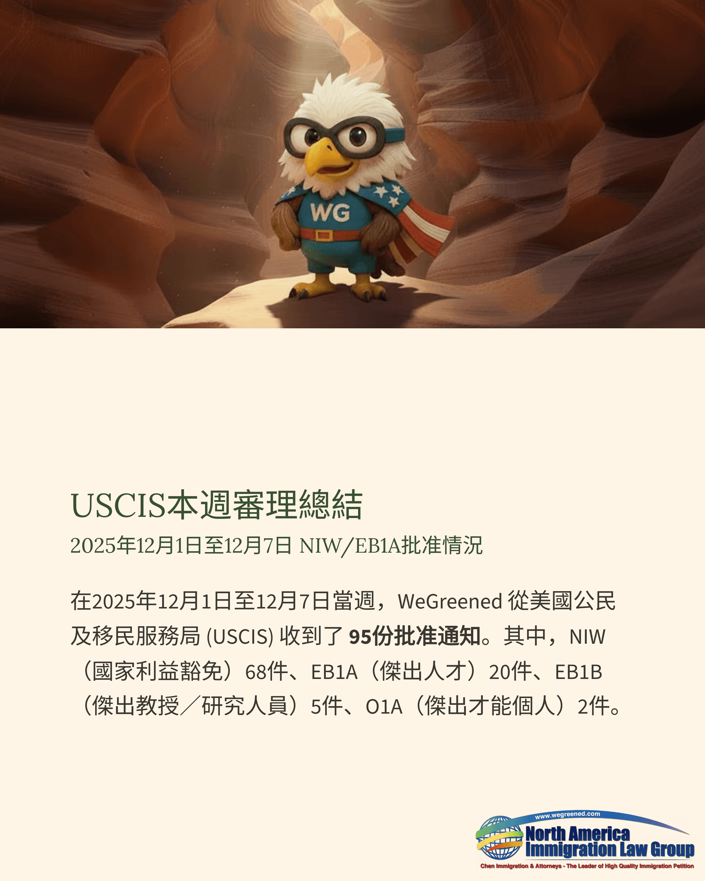 在2025年12月1日至2025年12月7日這一週內,WeGreened 共收到來自美國移民局(USCIS)的95份批准通知書。其中,NIW(國家利益豁免)68件、EB1A(傑出人才)20件、EB1B(傑出教授/研究人員)5件、O1A(傑出才能個人)2件。