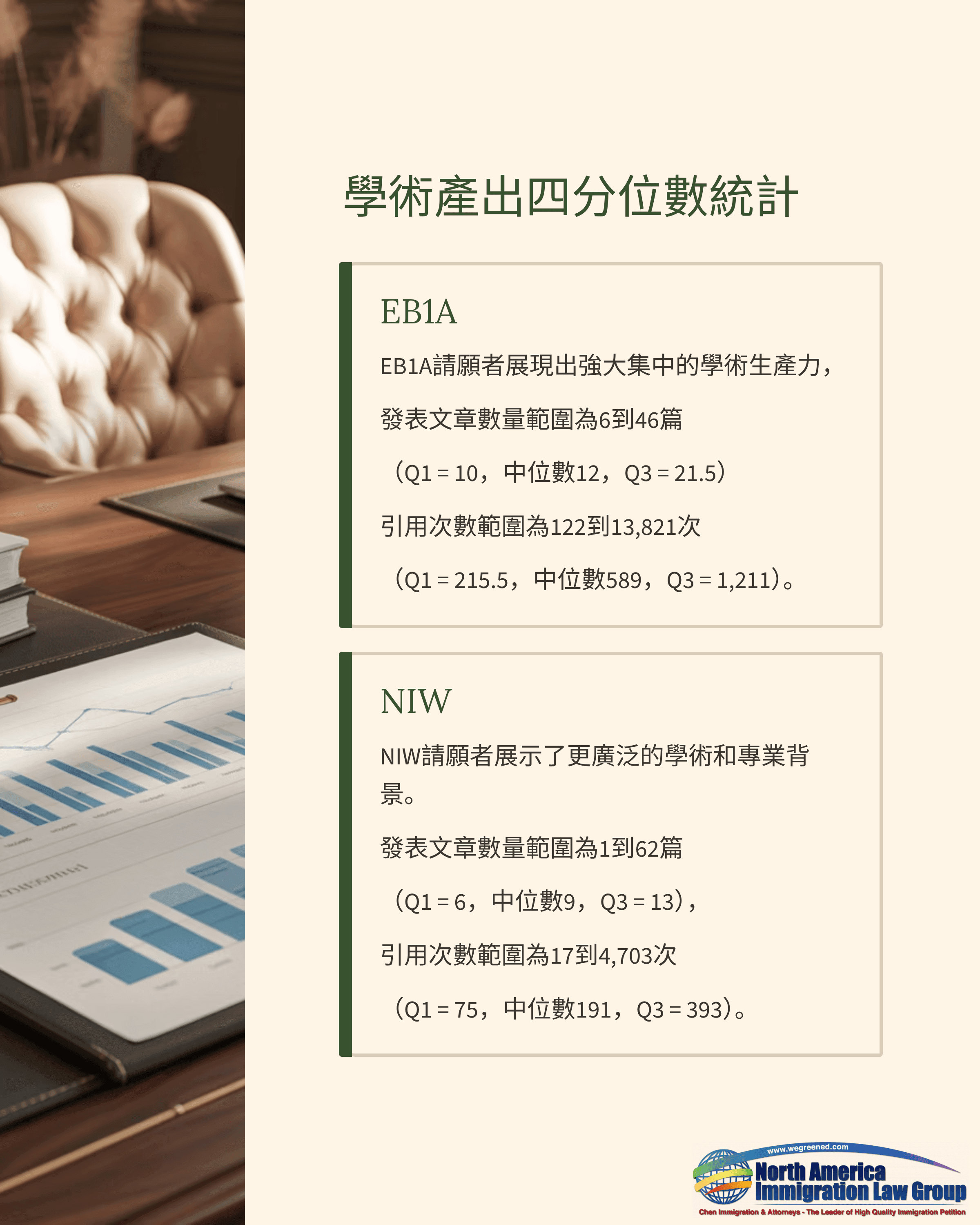 以上數據顯示:EB1A申請人的發表與引用整體水準較高且更為集中,體現出較強的學術影響力與國際同儕認可;NIW的分布則更為寬泛,反映出USCIS在評估「實質性價值」與「國家重要性」時,對處於不同職涯階段、同時具備學術與產業背景的申請人維持相當彈性與包容,即使引用量低於典型EB1A水準,只要整體紀錄能支撐國家利益層面的貢獻,仍有機會獲得批准。