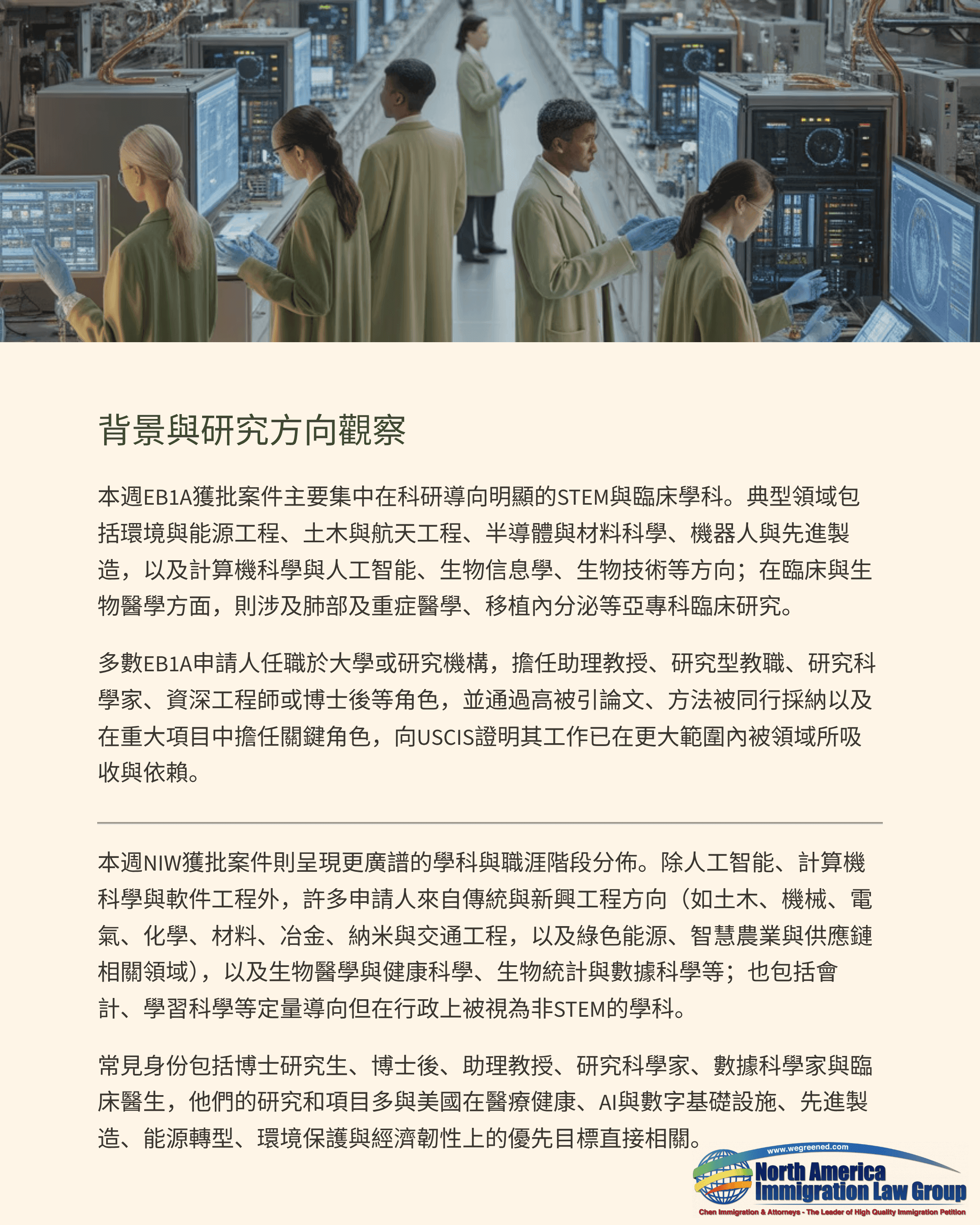 本週NIW獲批案件則展現更廣譜的學科與職涯階段分布。除人工智慧、電腦科學與軟體工程外,許多申請人來自傳統與新興工程方向(如土木、機械、電機、化學、材料、冶金、奈米與運輸工程,以及綠色能源、智慧農業與供應鏈相關領域),以及生物醫學與健康科學、生物統計與資料科學等;也包括會計、學習科學等定量導向、但在行政上被視為非STEM的學科。常見身份包括博士生、博士後、助理教授、研究科學家、資料科學家與臨床醫師,他們的研究與專案多與美國在醫療健康、AI與數位基礎設施、先進製造、能源轉型、環境保護與經濟韌性方面的優先目標直接相關。