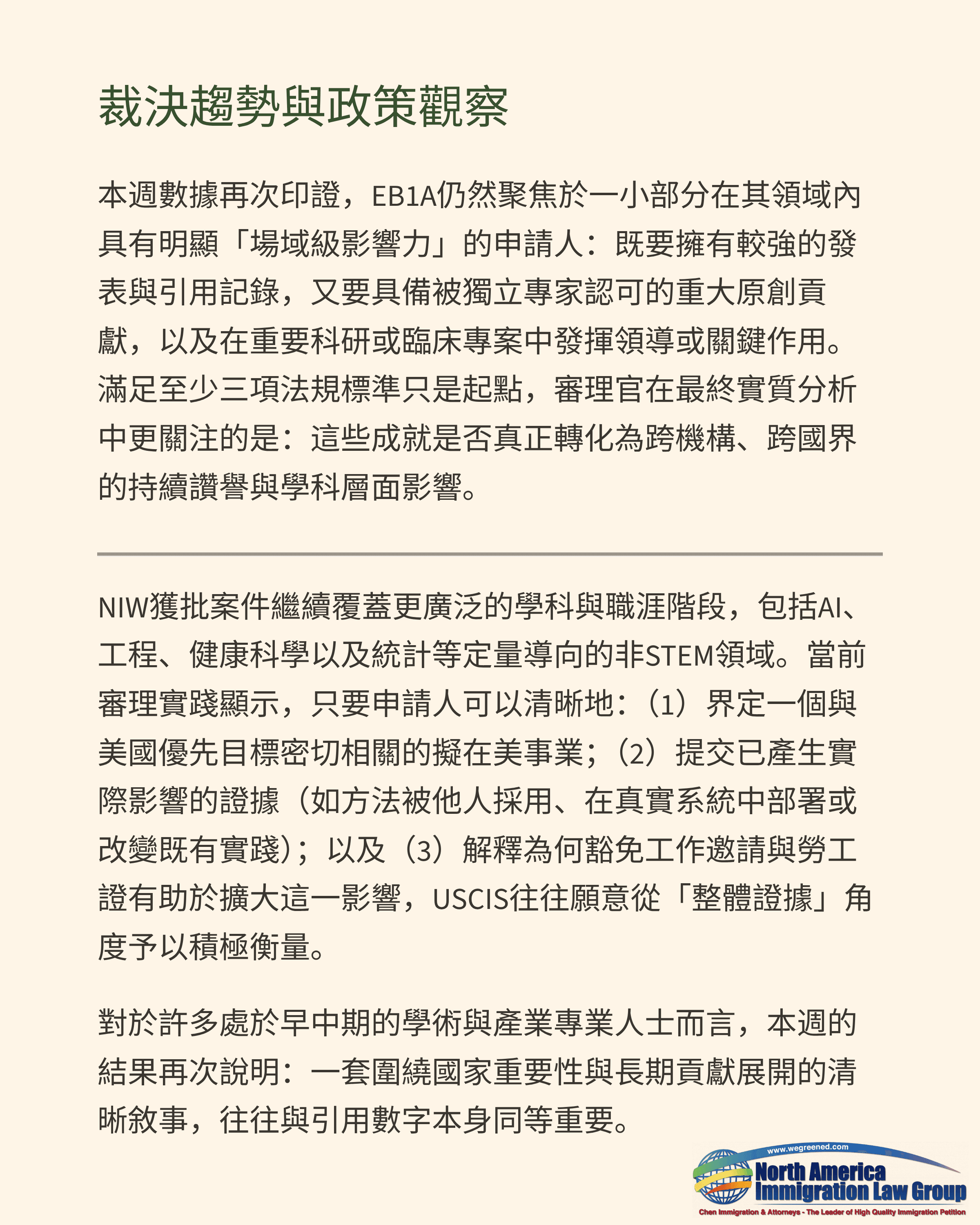 就NIW而論,獲批案件持續涵蓋更廣泛的學科與職涯階段,包括AI、工程、健康科學,以及統計等定量導向的非STEM領域。當前審理實務顯示,只要申請人能清楚:(1)界定與美國優先目標高度契合的擬在美事業;(2)提出已產生實際影響的具體證據(如方法被他人採用、在真實系統中部署或改變既有作法);以及(3)說明為何豁免工作邀請與勞工證有助於在美國擴大該影響,USCIS往往願意從「整體證據」的角度做出正面評估。對許多處於早期與中期職涯的學術與產業專業人士而言,本週的結果再次顯示:一套圍繞國家重要性與長期貢獻展開的清晰敘事,往往與引用數字本身同等重要。