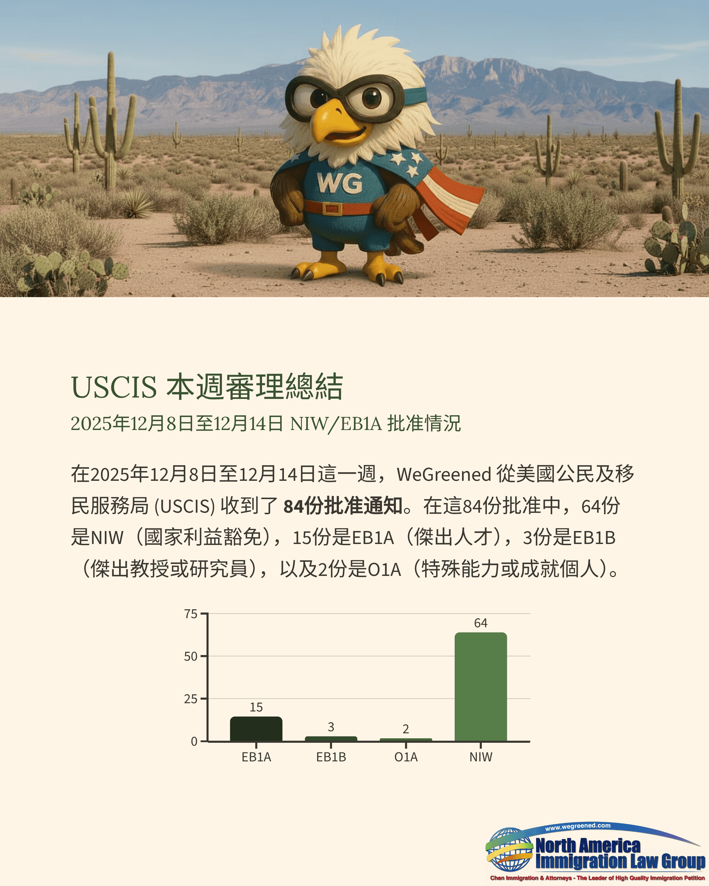 在2025年12月8日至2025年12月14日這一週內,WeGreened 共收到來自美國移民局(USCIS)的84份批准通知書。其中,NIW(國家利益豁免)64件、EB1A(傑出人才)15件、EB1B(傑出教授/研究人員)3件、O1A(傑出才能個人)2件。