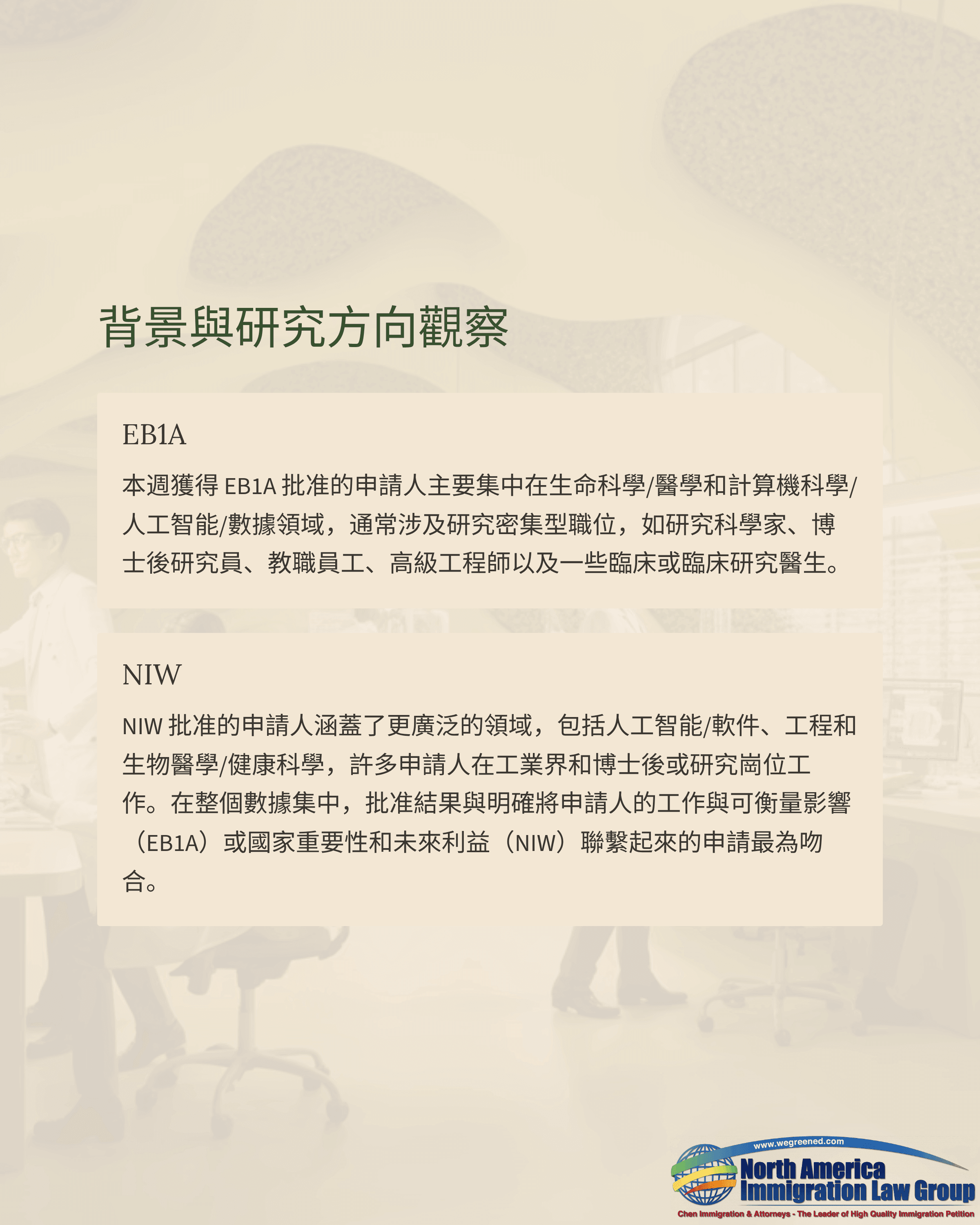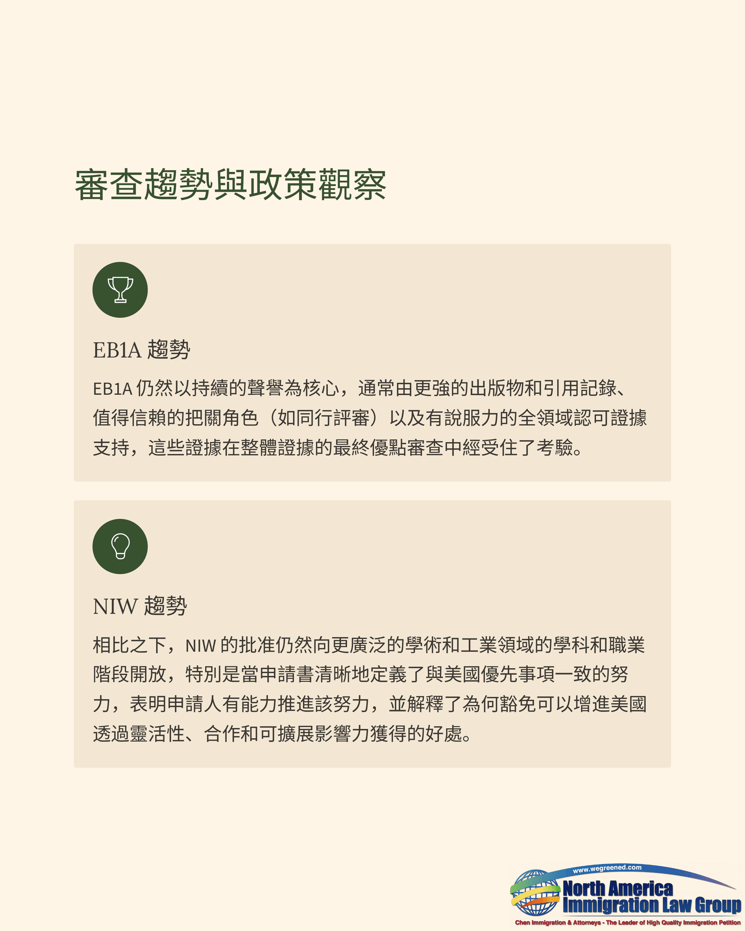 NIW則持續涵蓋更廣泛的學科與職涯階段,審理更重視申請人是否清楚界定與美國優先目標一致的擬在美事業、是否具備推進該事業的能力與證據基礎,以及豁免工作邀請與勞工證是否能擴大其對美國的整體利益。在不少案件中,圍繞國家重要性與可持續貢獻展開的清晰敘事,與論文/引用等量化指標同樣關鍵。