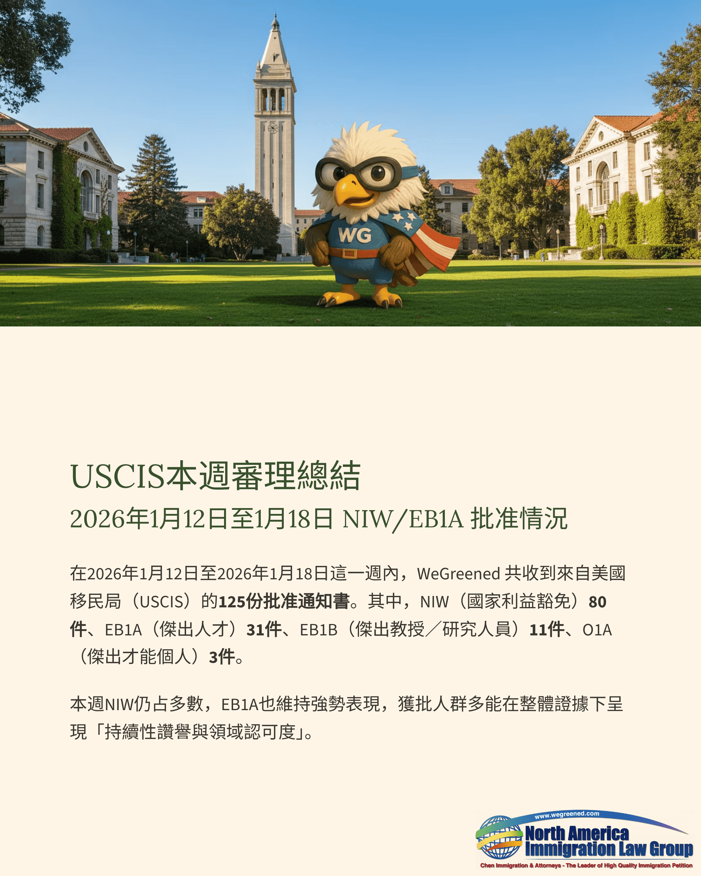 在2026年1月12日至2026年1月18日這一週內,WeGreened 共收到來自美國移民局(USCIS)的125份批准通知書。其中,NIW(國家利益豁免)80件、EB1A(傑出人才)31件、EB1B(傑出教授/研究人員)11件、O1A(傑出才能個人)3件。