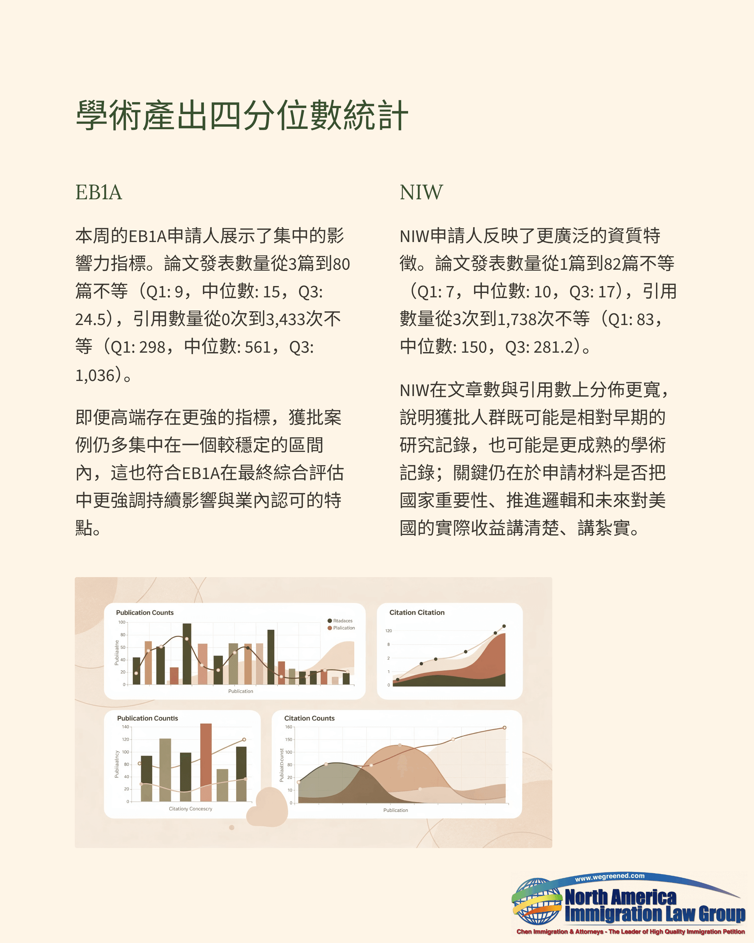 從分布來看,EB1A的中間段數據仍相對集中。即使高端有更強的指標,獲批案例多仍落在一個較穩定的區間,這也符合EB1A在最終整體評估中更看重長期影響與業界認可的特性。NIW在文章數與引用數上分布更寬,表示獲批人群既可能是相對早期的研究紀錄,也可能是更成熟的學術紀錄;重點仍在於材料是否把國家重要性、推進邏輯與未來對美國的實際效益講清楚、講扎實。