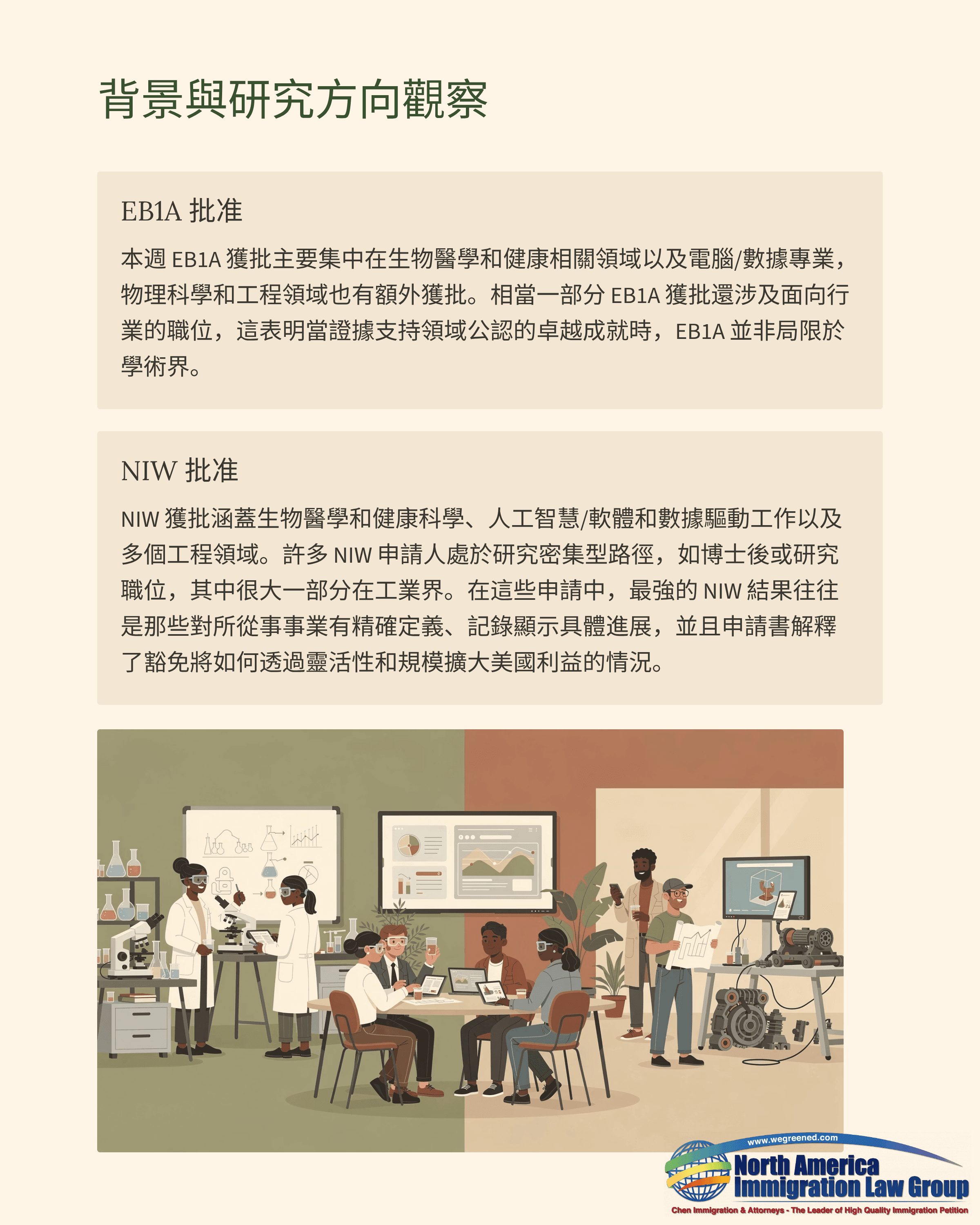本週EB1A獲批主要集中在生物醫學與健康相關方向,以及電腦/資料相關方向,同時也涵蓋物理科學與工程等領域。值得注意的是,本週EB1A中也有相當比例來自產業界,這再次說明只要證據能夠證明業界認可的卓越表現,EB1A並不侷限於學術路線。