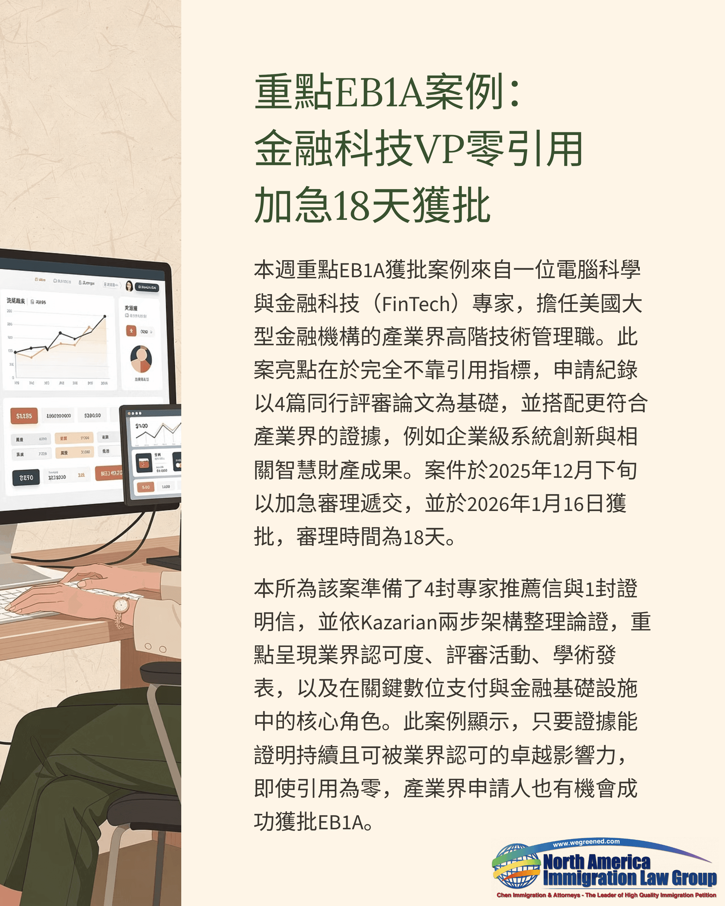 本週一例非常亮眼的EB1A獲批案例來自金融科技領域。申請人為電腦科學與金融科技專家,在美國大型金融機構擔任產業界高階技術管理職,職位為副總裁並兼任核心軟體工程負責人。本案最特別之處在於完全不依賴引用指標。申請紀錄包含4篇同行評審論文且引用為零,同時也呈現更符合產業界高影響力路線的成果,例如企業級系統創新與相關智慧財產布局。該案於2025年12月下旬以加急審理遞交,並在18天內獲批。為強化第三方佐證,本所為該案準備了4封專家推薦信與1封證明信,用來把申請人在真實業務場景中的影響力清楚轉譯成符合EB1A審理邏輯的證據。