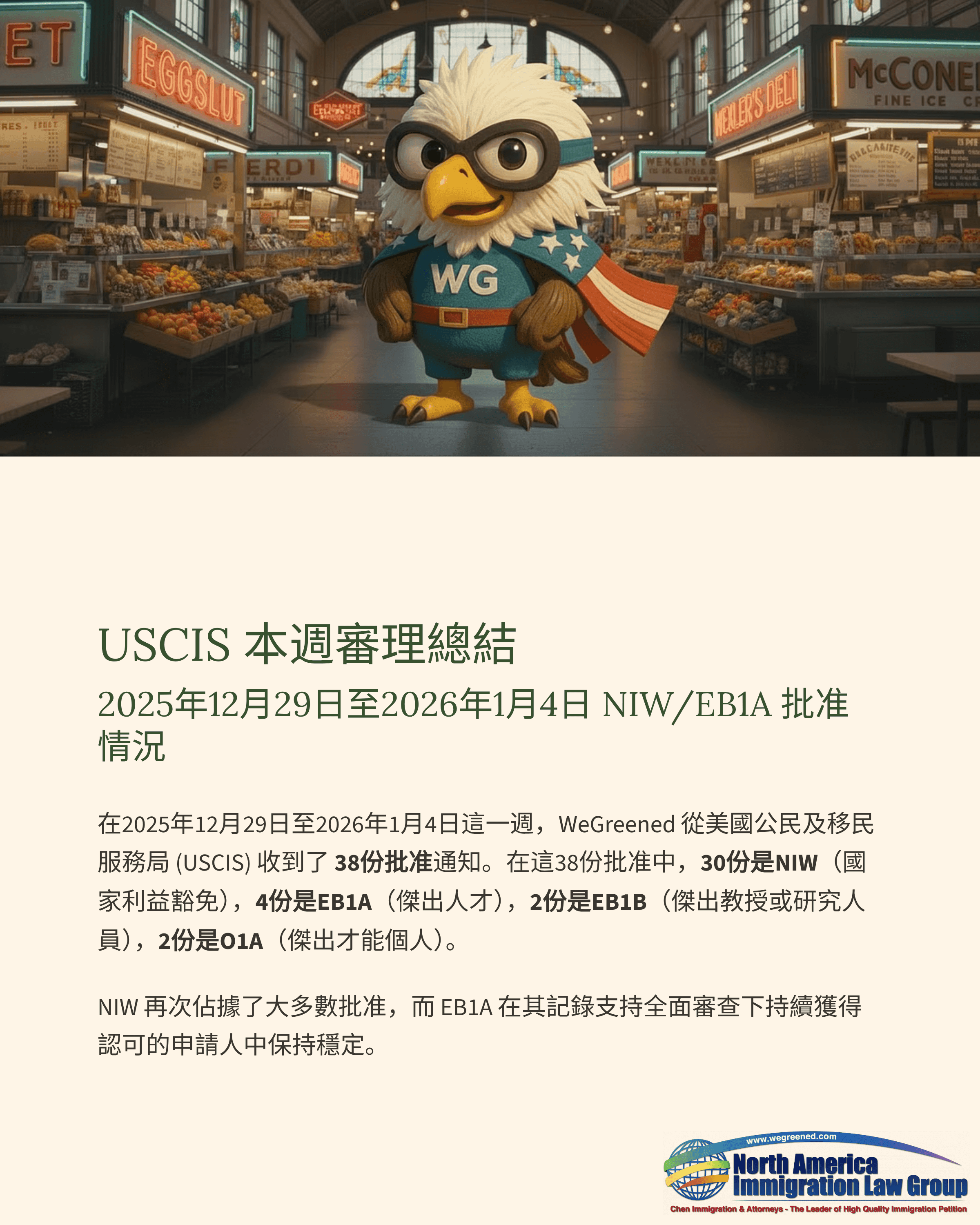 在2025年12月29日至2026年1月4日這一週內,WeGreened 共收到來自美國移民局(USCIS)的38份批准通知書。其中,NIW(國家利益豁免)30件、EB1A(傑出人才)4件、EB1B(傑出教授/研究人員)2件、O1A(傑出才能個人)2件。