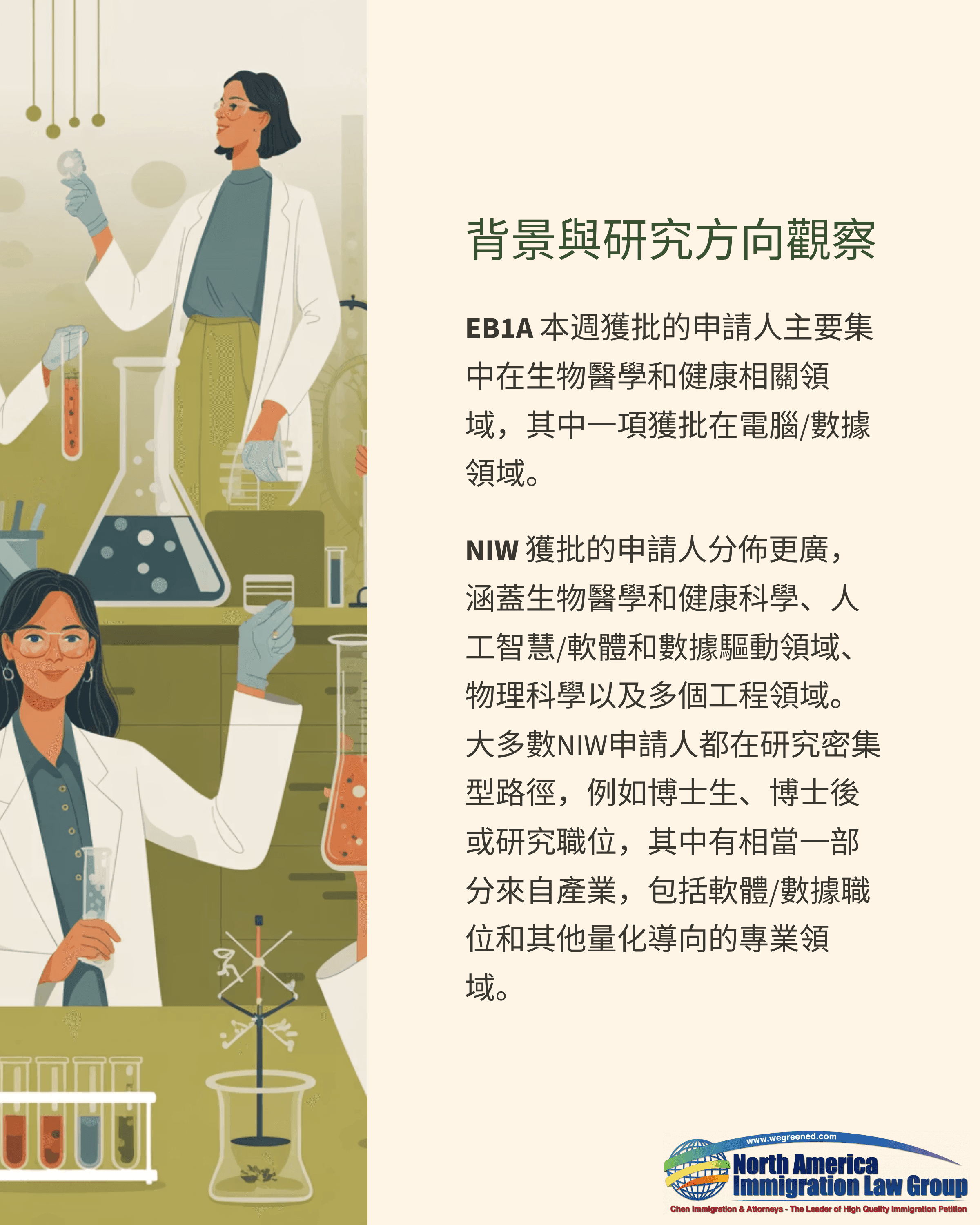 本週EB1A獲批主要集中在生物醫學與健康相關領域,同時也有1例來自電腦/資料相關方向。本週NIW獲批範圍更廣,涵蓋生物醫學與健康科學、AI/軟體與資料相關方向、物理科學,以及多個工程方向。多數申請人走研究型路線,例如博士生、博士後或研究職位,同時也有一部分來自產業界,包括軟體/資料職位與其他偏量化的專業方向。