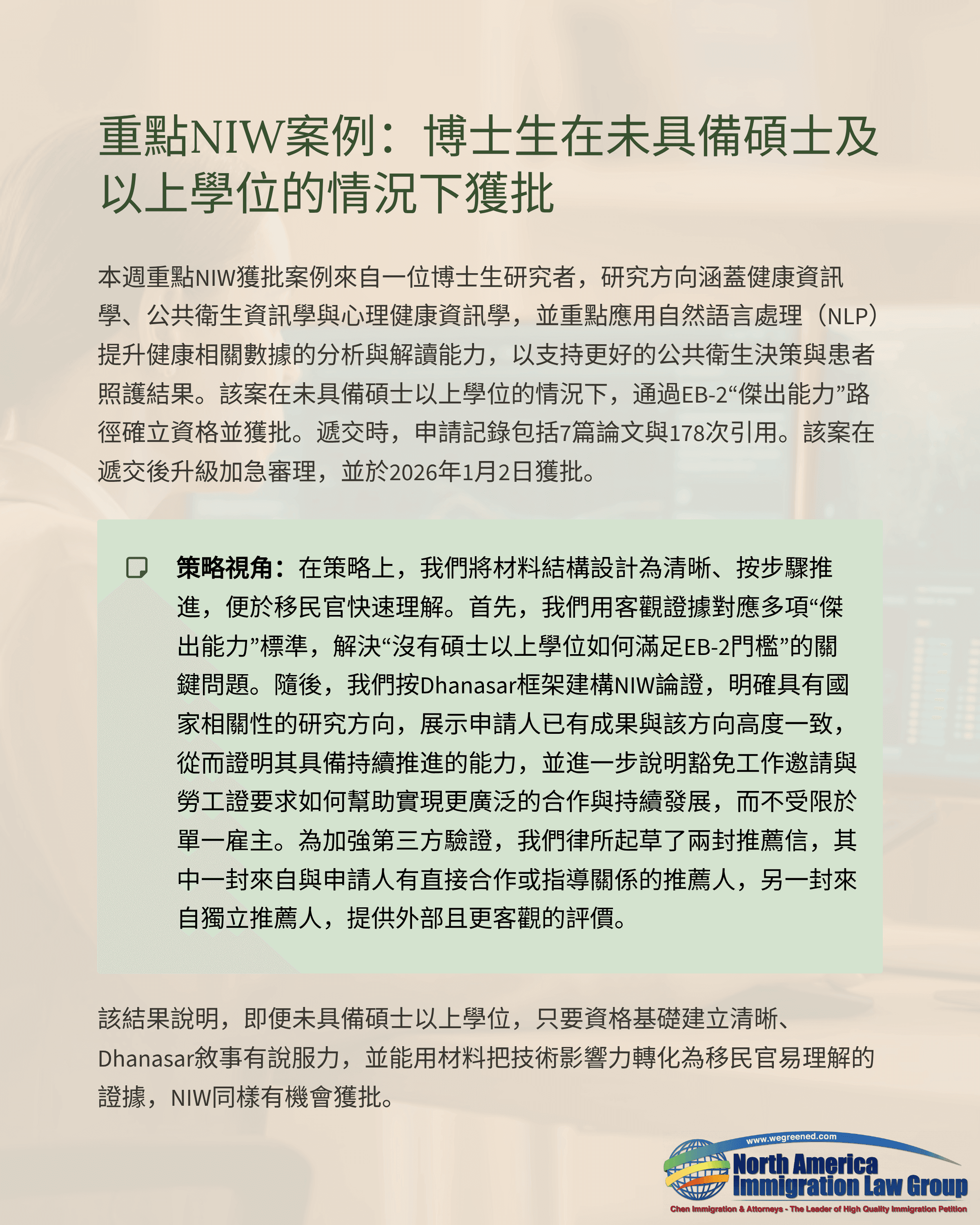 重點NIW案例:博士生在未具備碩士以上學位的情況下獲批