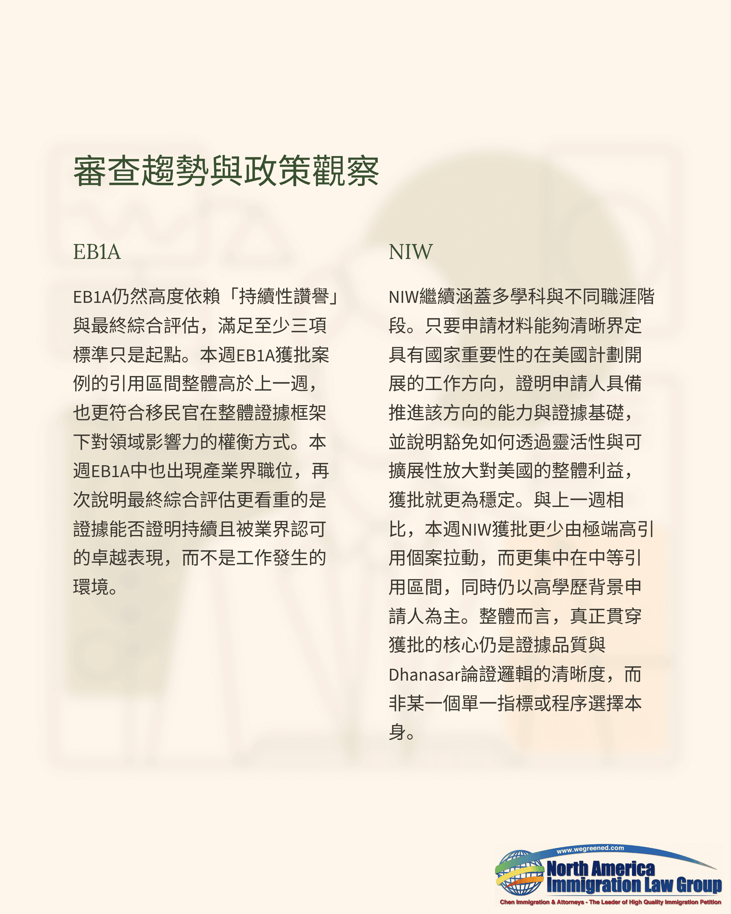 本週NIW仍占多數,EB1A則在能以整體證據證明「持續性讚譽與領域影響力」的申請人中維持穩定表現。