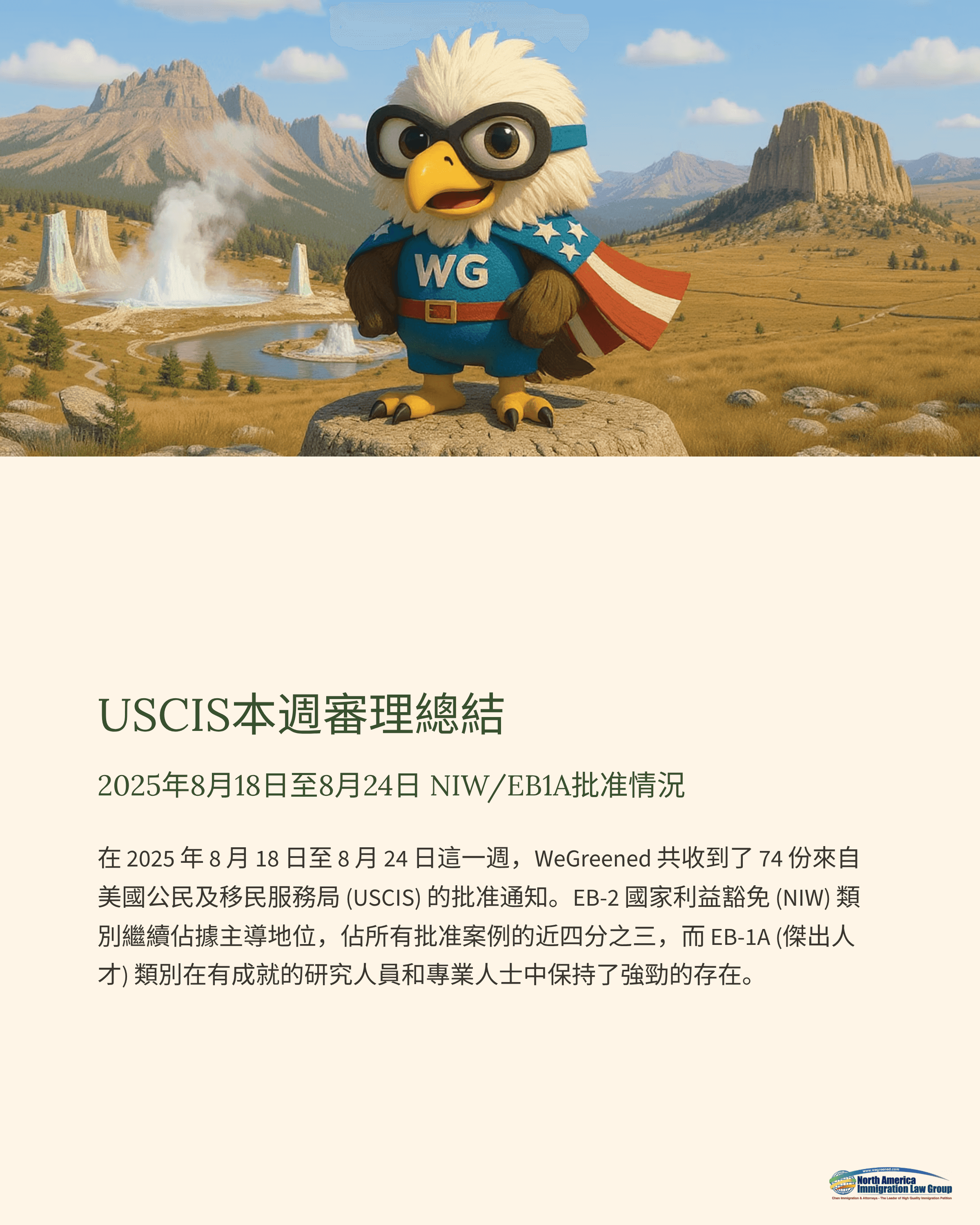 在2025年8月18日至8月24日這一週內,WeGreened 共收到來自美國移民局(USCIS)的 74份批准通知書。其中,EB-2 NIW(國家利益豁免)持續保持主導地位,約佔所有批准案件的七成;EB-1A(傑出人才)類別在科研人員與專業人士中同樣維持穩定表現。
