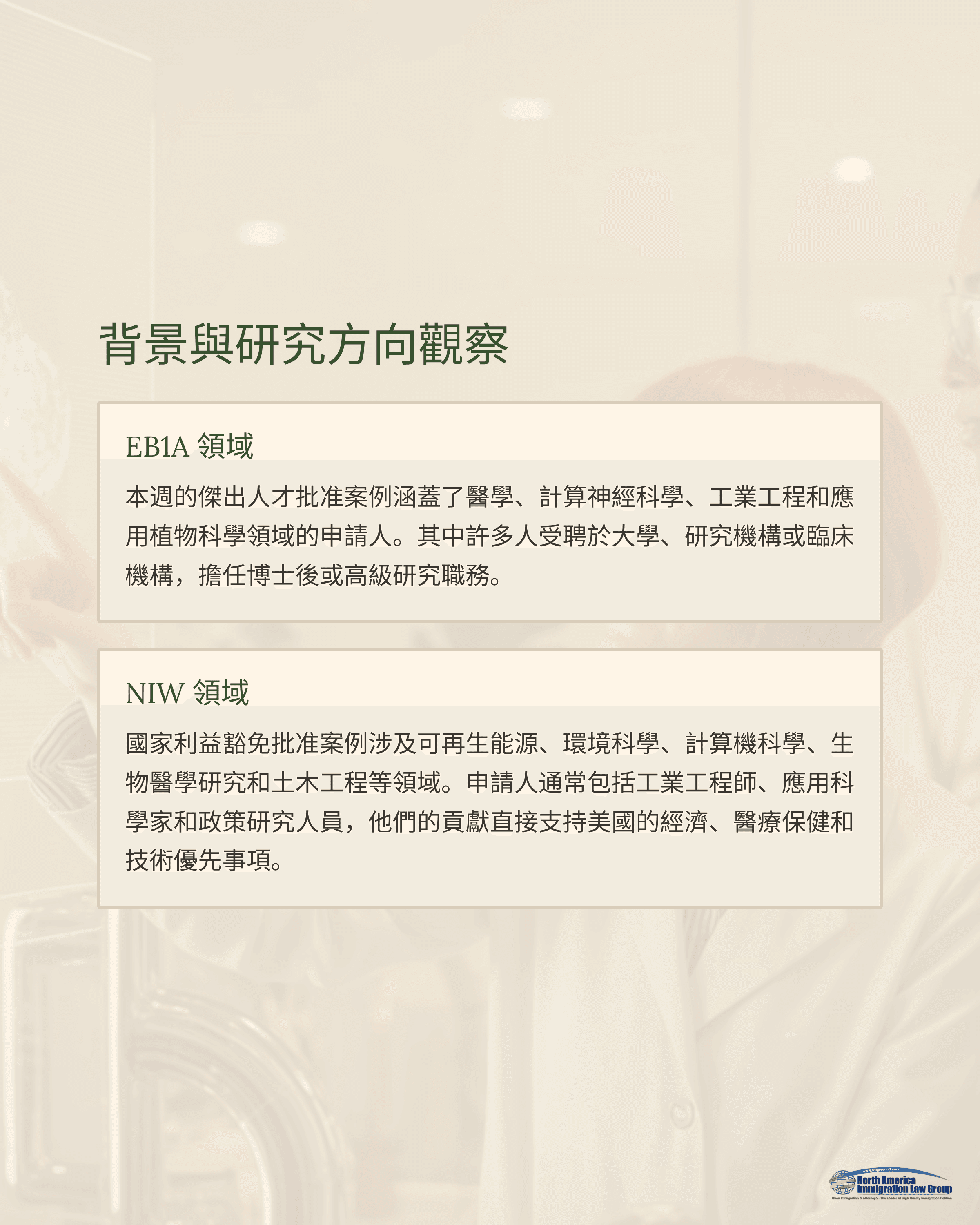 NIW案件 涉及再生能源、環境科學、電腦科學、生物醫學研究及土木工程等方向。許多申請人來自產業界,擔任工程師、應用科學家或政策研究員,他們的工作與美國的經濟、環境及醫療優先發展目標緊密契合。